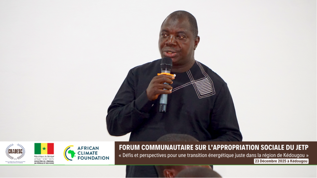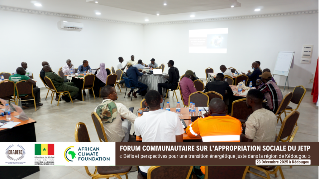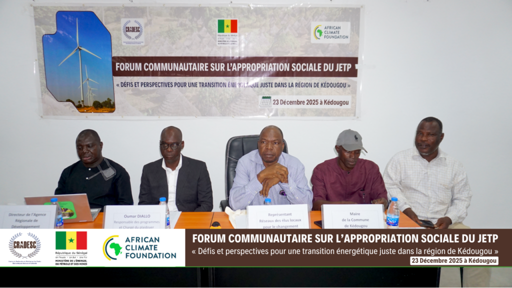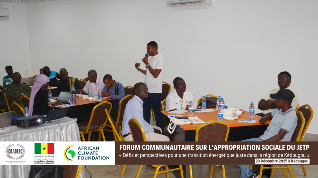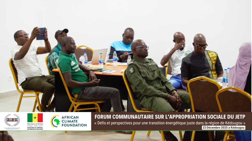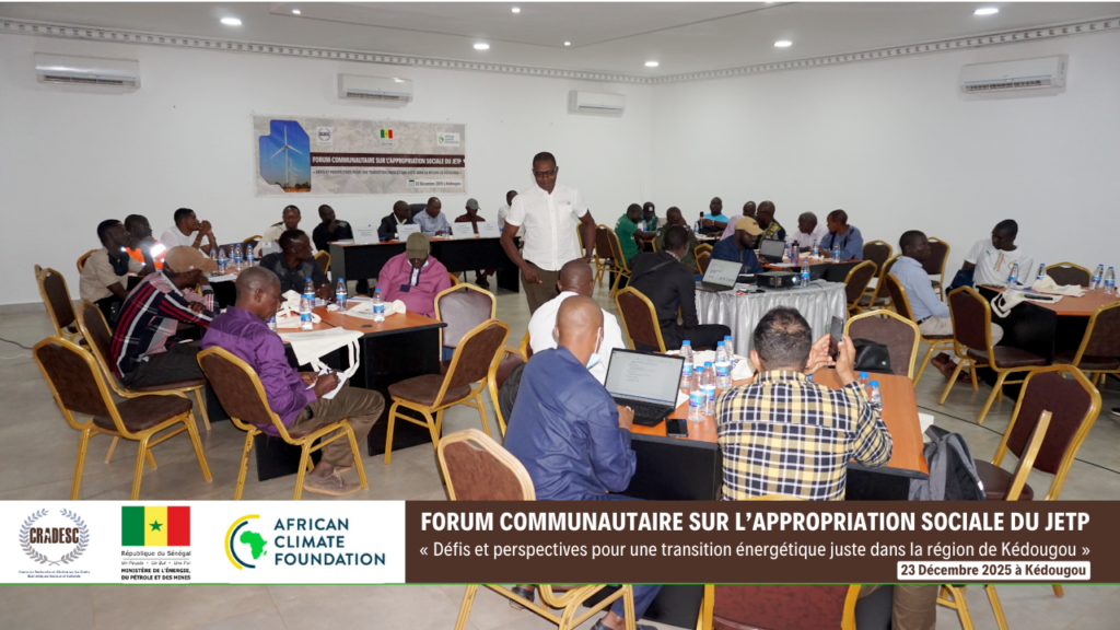 La région de Kédougou a accueilli un forum communautaire sur la Transition Énergétique Juste, organisé dans le cadre du projet RECANE (Renforcement de Capacités des Acteurs Non Étatiques), mis en œuvre par le CRADESC, en partenariat avec l’African Climate Foundation (ACF). Organisée en soutien au Partenariat pour une Transition Énergétique Juste (JETP) au Sénégal, cette rencontre a particulièrement pris en compte les spécificités de cette partie du sud-est du pays.