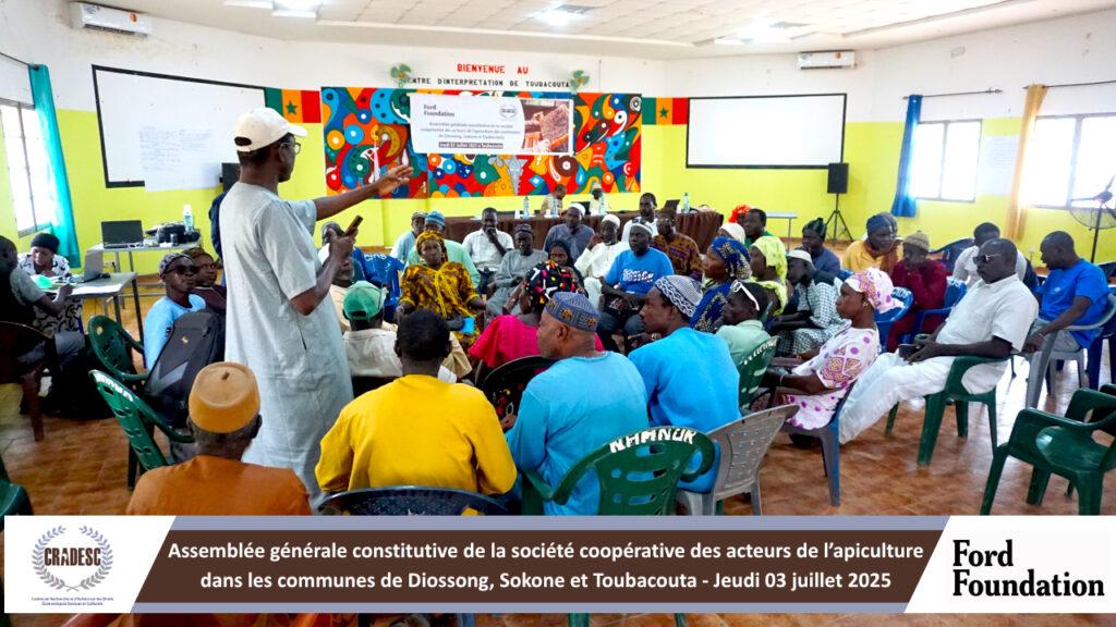 Les acteurs de l’apiculture des communes de Diossong, Sokone et Toubacouta ont désormais leur coopérative, qui devrait favoriser une expansion de la filière miel dans cette zone du Delta du Saloum. Ils ont organisé une assemblée générale constitutive le 3 juillet 2025 à Toubacouta avec l’appui du CRADESC et son partenaire la Fondation Ford à l’issue de laquelle la coopérative a été créée.