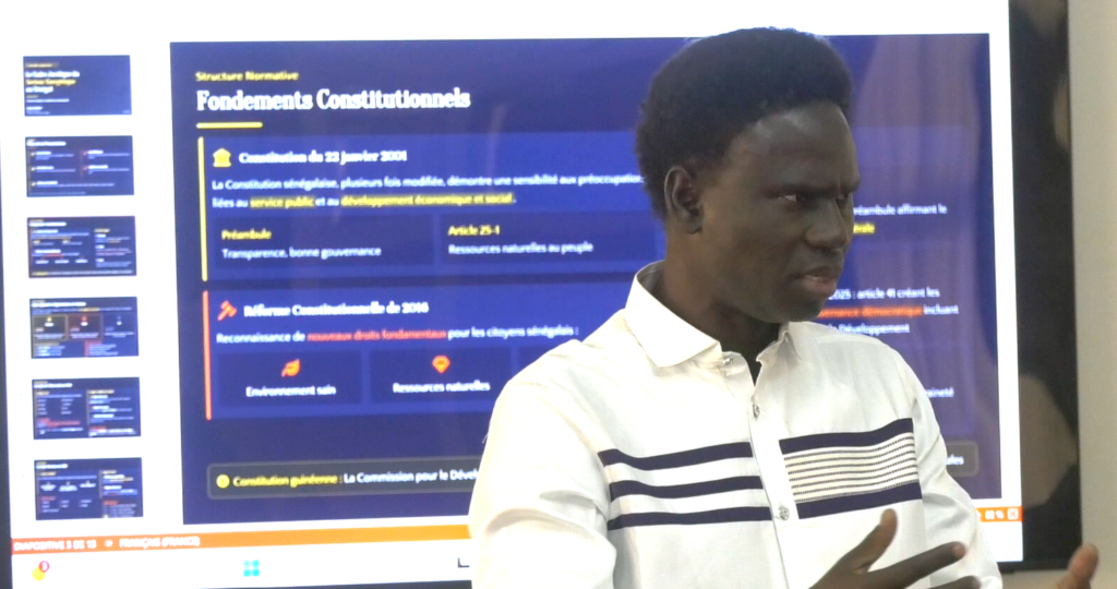 La session animée par le spécialiste du droit public, le Professeur Meïssa DIAKHATE , a porté sur le cadre juridique et institutionnel du secteur énergétique au Sénégal, en mettant en lumière la Constitution de 2001 et les principaux codes régissant l’électricité, le pétrole et le gaz. Le Pr DIAKHATE a souligné le rôle des institutions publiques dans la régulation et la nécessité de moderniser la législation pour accompagner la transition énergétique et les investissements dans les renouvelables.